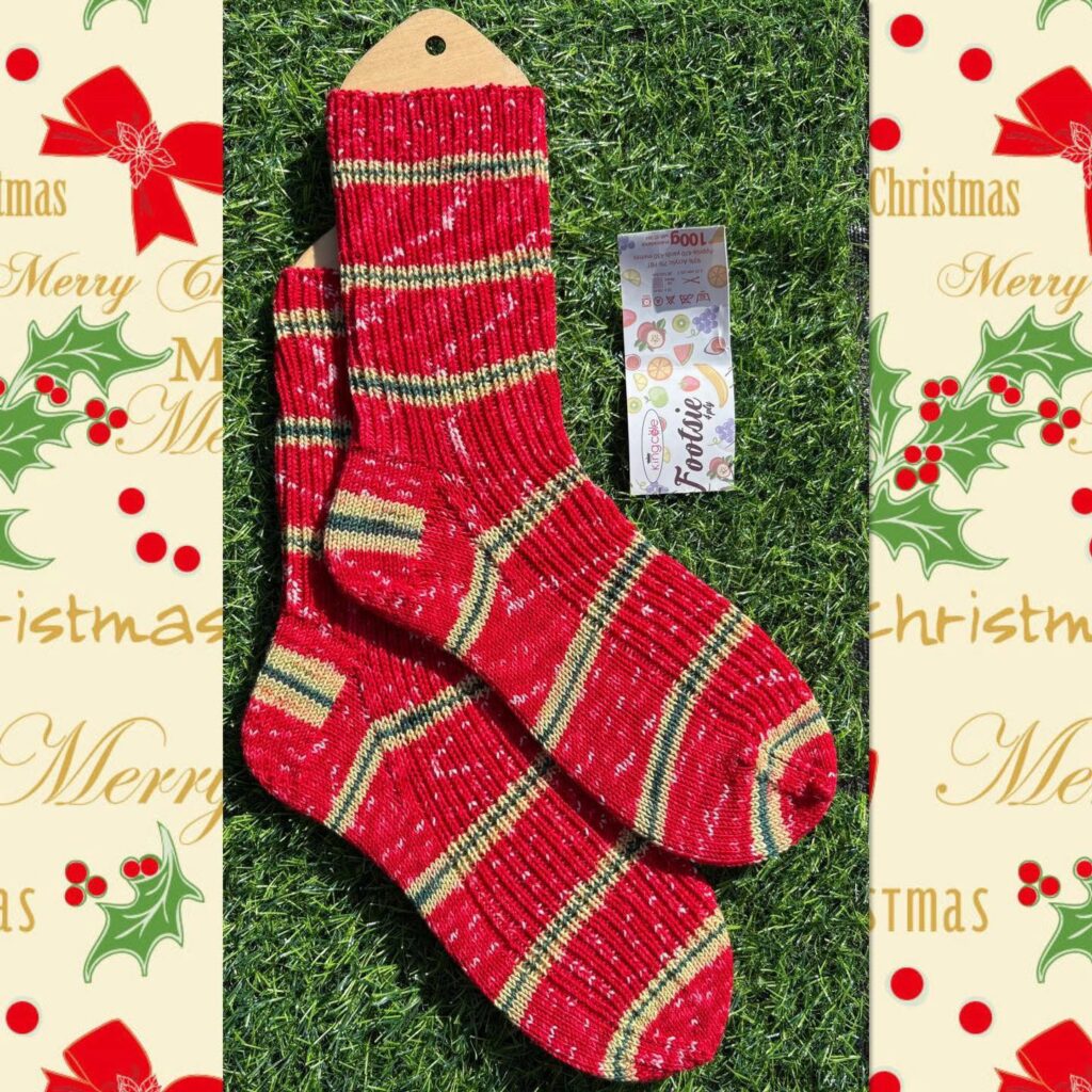 Christmas Craft sale 2025. Item 1. Size 6. Adult socks beautifully knitted in King Cole footsie yarn. Colour way ‘Christmas Fruits
