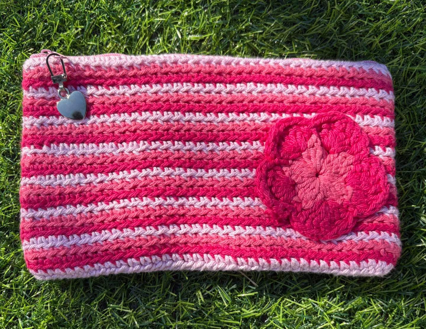 Christmas Craft Sale 2025. Item 15. Beautifully crocheted pencil/hook case in shades of delicious pink! Adorable flower motif and metal heart charm on the zip. Measures 20cm by 11cm approximately