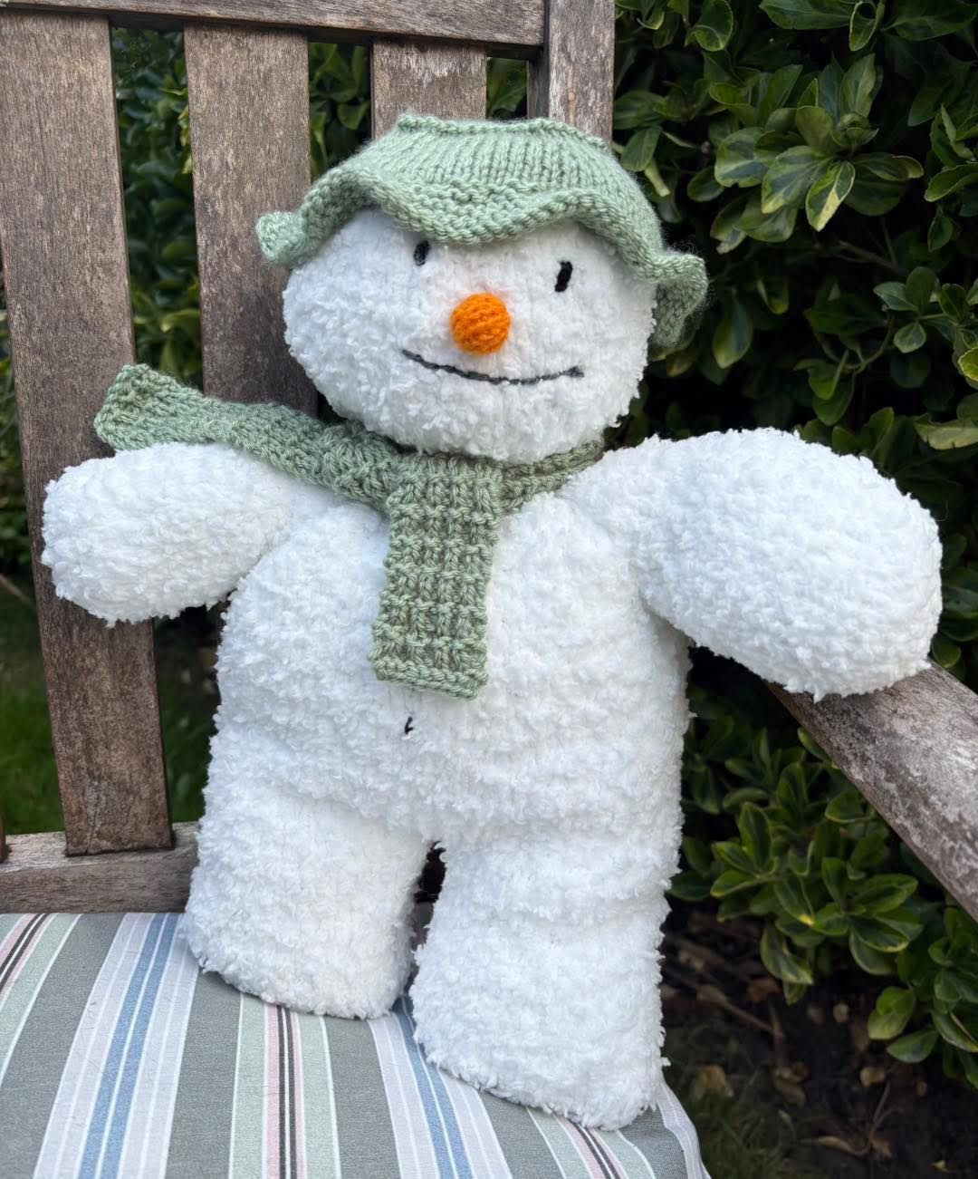 Christmas Craft Sale 2025. Item 22. We’re walking in the air! It’s The Snowman! Super cuddly and friendly and this one won’t melt! Beautifully knitted in Sirdar Snowflake with acrylic hat and nose. Wash on wool cycle. It’s just super. Measures app