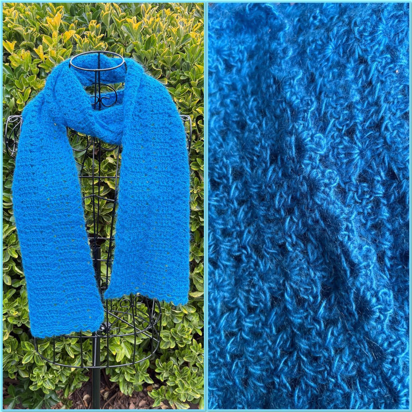 Christmas Craft Sale 2025. Item 115. Stunning Winter’s Edge scarf (pattern Elena Hunt) in this deep delicious rich blue. It’s super soft and beautifully knitted in Patons Solo. 56% acrylic , 24% wool, 20% mohair. Gentle hand wash only. Measures approximately 20cm wide and 172cm long. . Just fantastic.