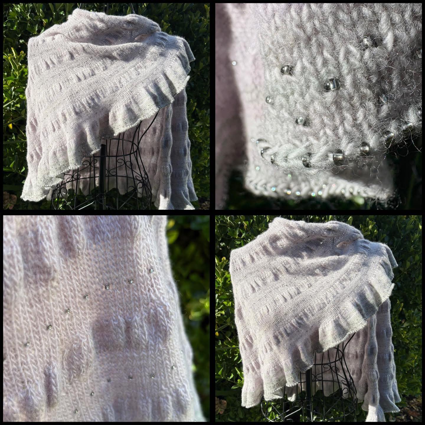 Christmas Craft Sale 2025. Item 139. Stunning ‘Citron’ wrap in gorgeous Malabrigo Lace. As light as a feather and cosy too. Beautifully knitted in the finest merino wool. Do zoom in to see. Astonishing. There is the most beautiful tiny beading throughout and all the bottom edge. Perfect for all year round use! Gentle hand wash only. Measures approx 190cm by 70cm at its widest point. An incredible gift.
