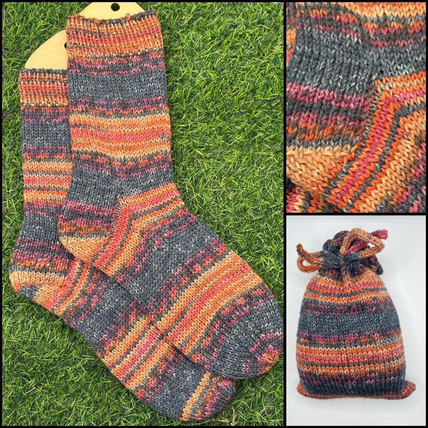Christmas Craft Sale 2025. Item 55. Size 6/7 Beautifully knitted socks in Opal sock wool. 75% wool and 25% polymid. Dark blue grey and orange. Gentle machine wash and dry flat. Come present in this gorgeous drawstring bag!