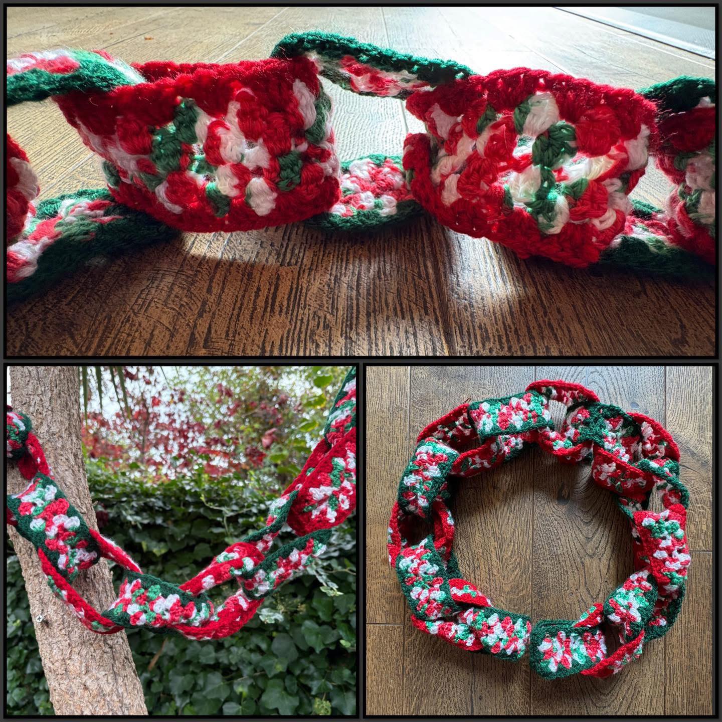 Christmas Craft Sale 2025. Item 63. Paper chain! Beautifully crocheted and super festive ‘paper’ chain garland. Made in chunky mixed fibre yarn. Chains measure approx 6cm, whole garland is approximately 145cm long. This is just lovely!