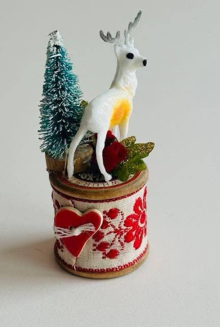 Christmas Craft Sale 2025. Item 151. Beautiful cotton reel Whimsy decoration with red heart button. We love these! Gorgeous piece of Christmas art. Measures 8cm by 4cm. Fabulous!
