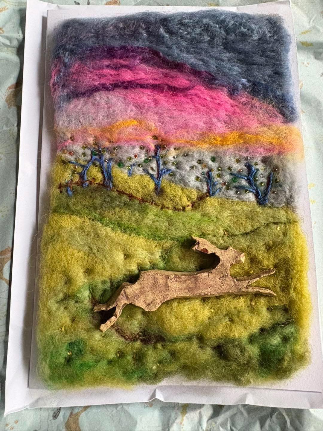 Christmas Craft Sale 2025. Item 154. Stunning catmint card. Beautifully felted mixed fibres and porcelain hare. Worthy of a frame! Card is blank inside for your own message and comes complete with an envelope. Gorgeous. 20cm by 15cm.