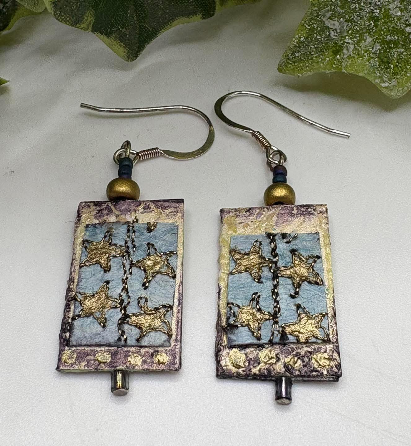 Christmas Craft Sale 2025. Item 198. Beautifully embroidered paper earrings with a centre panel of embossed copper stars. Earhooks are sterling silver and the earrings are varnished for durability. Lightweight to wear. Drop 3cm.