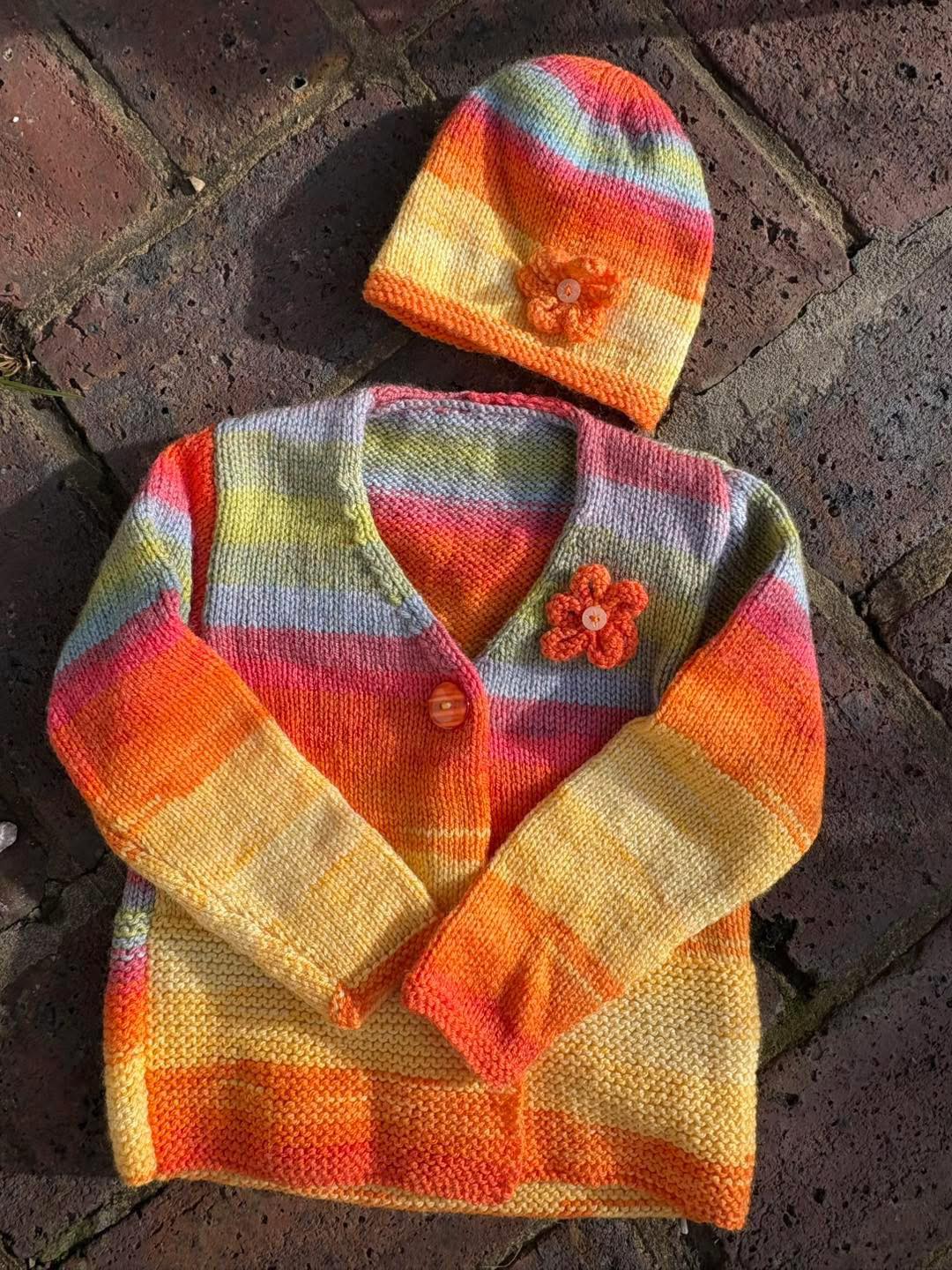 Christmas Craft Sale 2025. Item 212. Age 2/3. This set is so beautiful it is SINGING! An absolutely gorgeous knitted cardigan and hat set. Delicious in Robin Paintbox DK. A super practical and soft acrylic which is machine washable. Happy sigh.