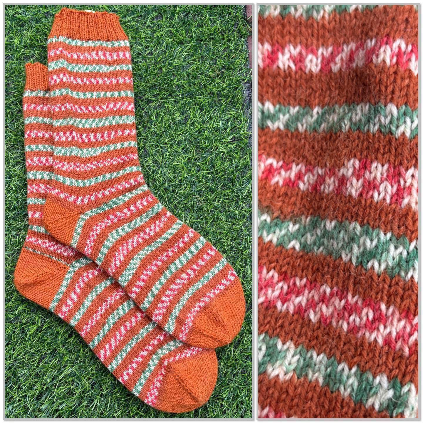 Christmas Craft Sale 2025. Item 213. Size 5-7 adult. Beautifully knitted and utterly gorgeous gingerbread socks! Made in stunning West Yorkshire spinners yarn, contains 35% blue faced Leicester wool. Shades Gingerbread and Amber. Gentle wool cycle. Dry flat. Perfect for lounging/bedsocks. Ideal for those chilly evenings. Just super.