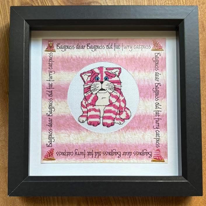 Beautiful cross stitch of Bagpuss. Comes ready framed. (20cm by 20cm) Absolutely fabulous! Nostalgia. Right here. Love!