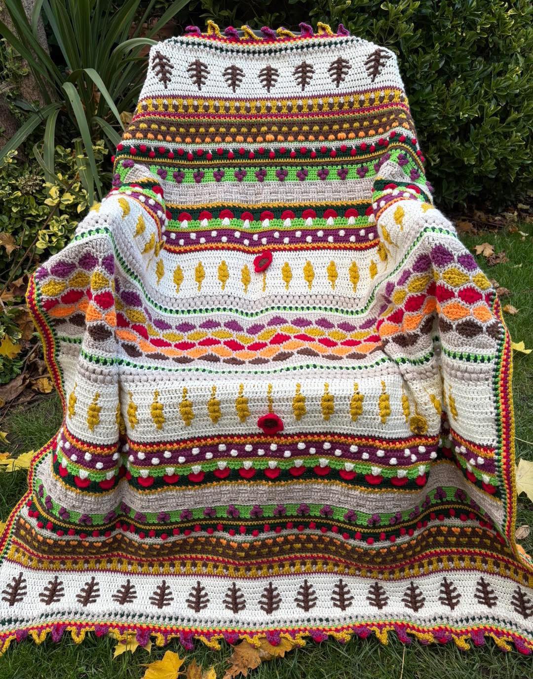 Christmas Craft Sale 2025. Item 280. ‘Fall into Autumn’ Blanket Just wow. An astonishing amount of work here! From poppies to berries and acorns to toadstools, this blanket features all of your seasonal favourites.