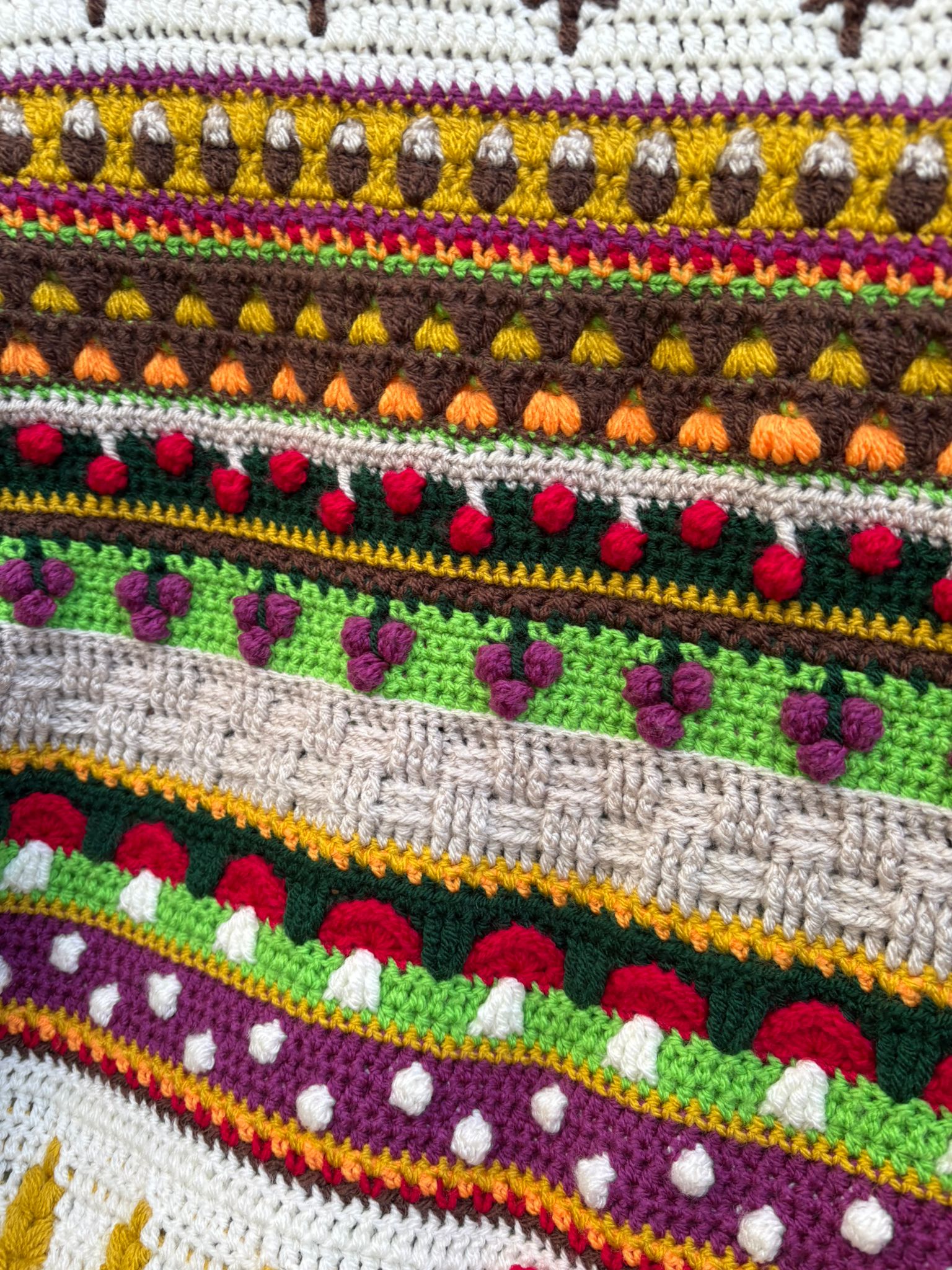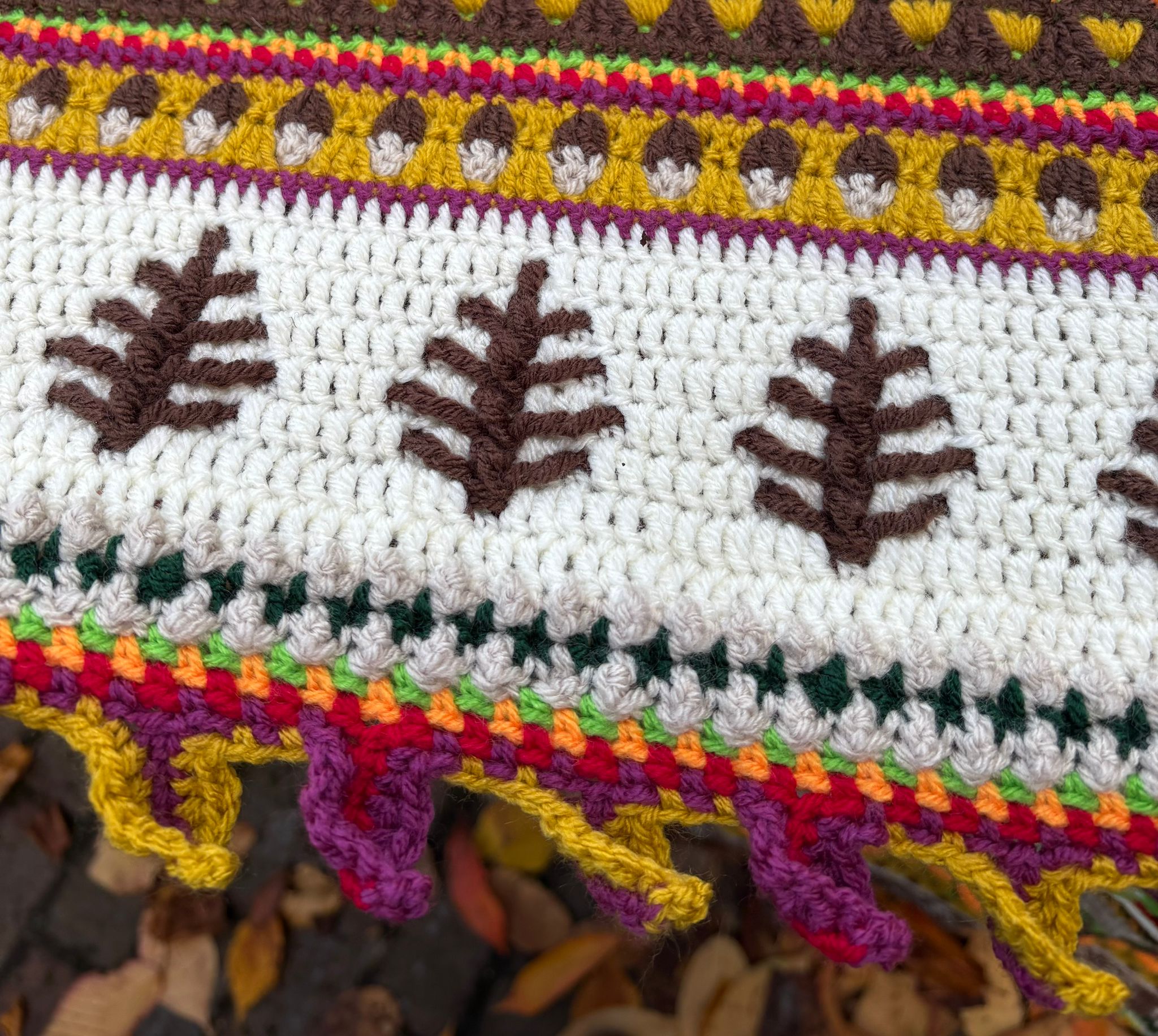 Christmas Craft Sale 2025. Item 280. ‘Fall into Autumn’ Blanket. Just wow. An astonishing amount of work here! From poppies to berries and acorns to toadstools, this blanket features all of your seasonal favourites. Based on a design by Alice Tarry. (We believe) Rich in colour and texture. This would make an incredible gift. Perfect for sofa, child, lap blanket. Delicious. Measures approximately 160cm by 140cm. Check out the border, it’s autumn leaves! Gentle machine wash. Stylecraft special DK yarn