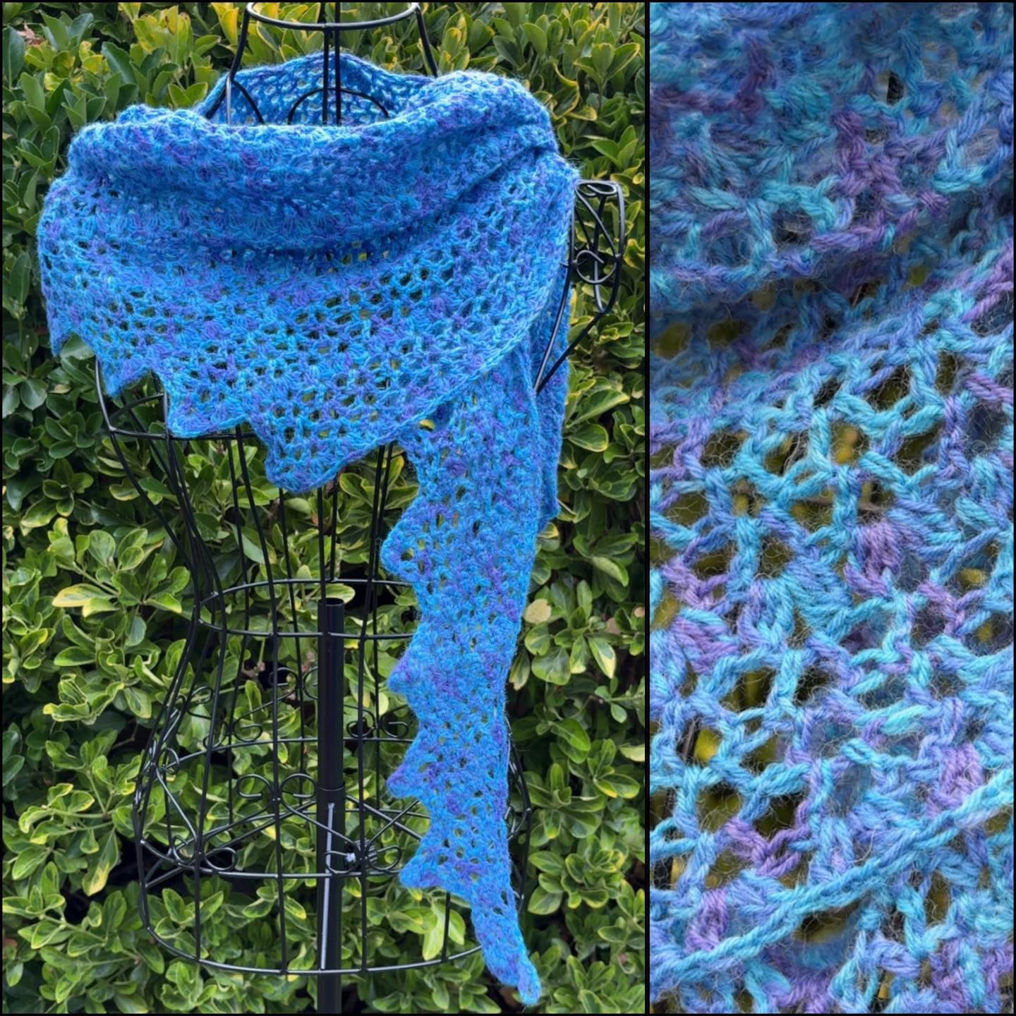 Christmas Craft Sale 2025. Item 366. Tendril, triangular wrap. Designed by anniedesigncrochet.com Absolutely gorgeous scarf/shawl type wrap in a rich turquoise/purple mix. Yarn – Araucania Ranco Luxury blend 4ply- , 75% wool, 25% polyamide. . Gentle machine wash on wool cycle.