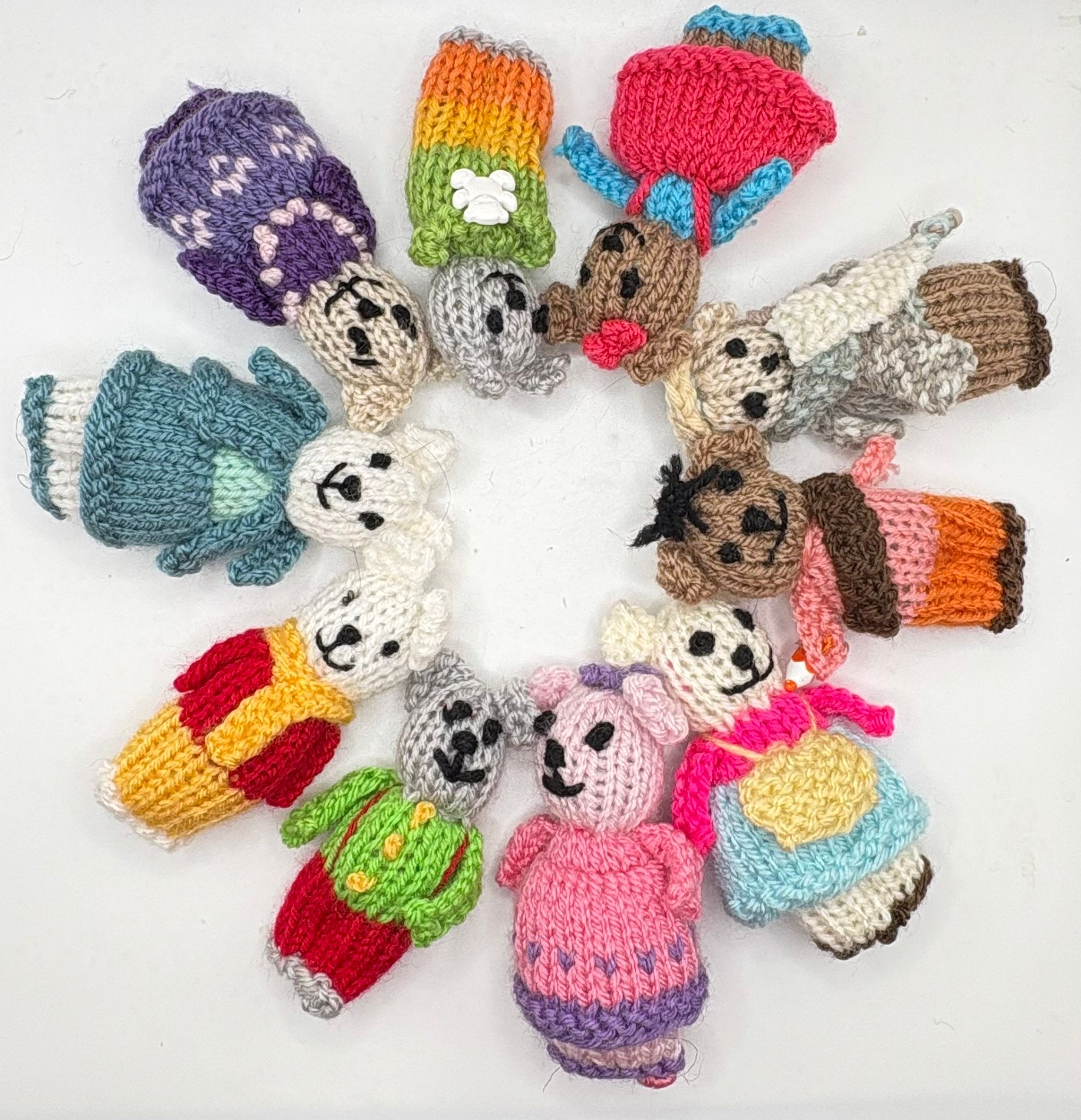 Christmas Craft Sale 2025. Item 413. Ten Tiny Teddies in a Handbag House! This is ENCHANTING! Teddies are approx 10cm tall so perfect for a little hand. Beautifully knitted in Stylecraft Special DK. The handbag house measures approximately 22cm by 16cm.