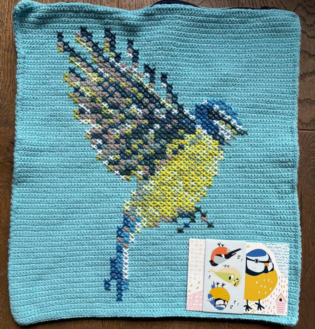 Christmas Craft Sale 2025. Item 418. Stunning blue tit in flight cushion cover! Beautifully crocheted in sky with cross stitch motif. From the Scheepjes Dawn Chorus designed by Liz of Bizzymitts. Measures approx 42 x 42cm. Zip fastening. Pad not included. A wonderful gift!