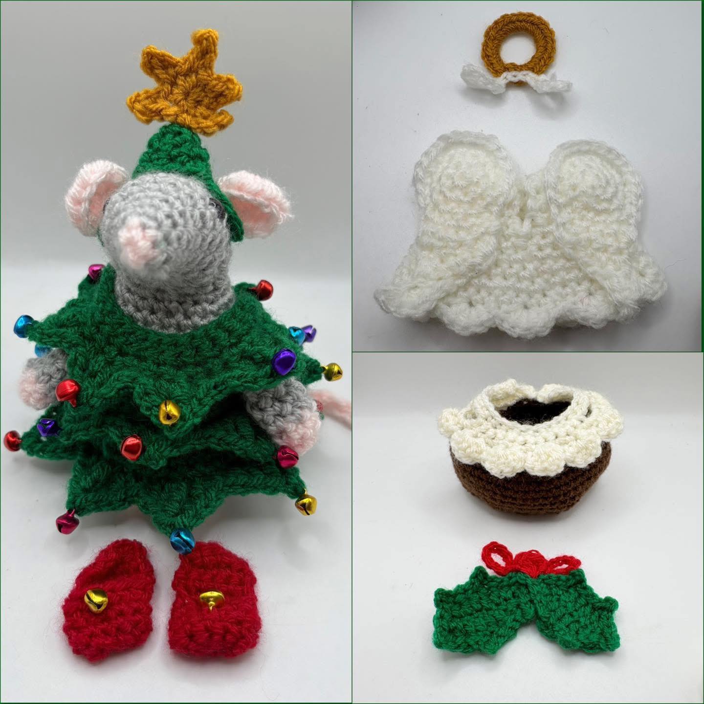 Christmas Craft Sale 2025. Item 420. Christmas MouseFits!Squeal! This is enchanting. Adorable little white mouse (approx 14cm) comes with three gorgeous Christmas outfits. One for all occasions! The tree has jingle bell baubles and glorious red shoes, then she can be a Christmas angel complete with halo, or a pudding with holly! This is beautifully crocheted and will make someone’s Christmas very special indeed. Is designed by Lauralovescrochet. Gorgeous treasure!
