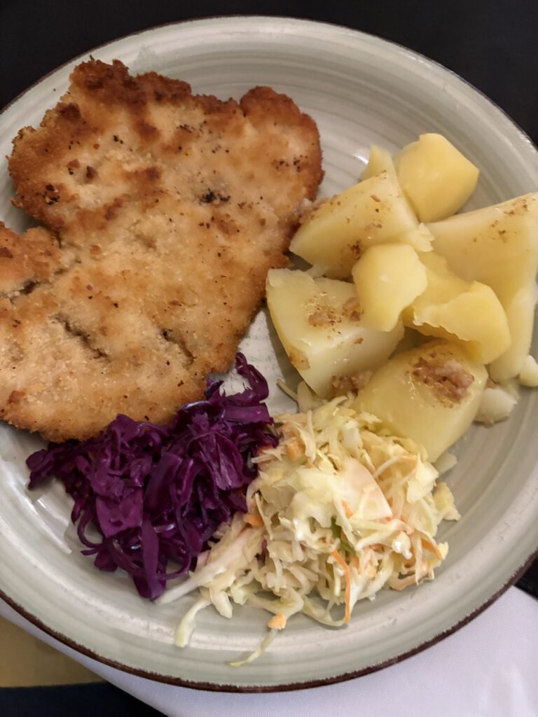 Dinner time! First we had soup. Tradition is that a meal isn’t a meal without a soup to start. Let’s bring this back to the UK! Two types of cabbage, potatoes and schnitzel. Fabulous. We were so hungry at this point, we demolished it. As did the kids. Great to see!