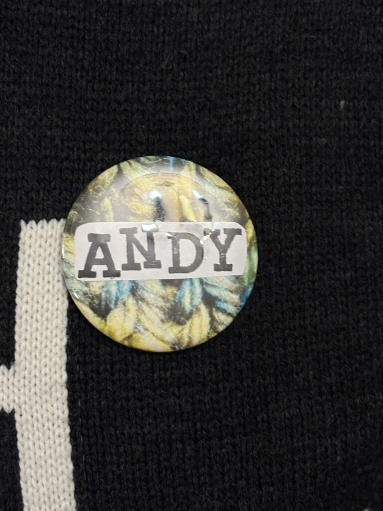 And onto badge making. We all have them and this is really going to help us get to know each other. Andy pulls out his badge from the Gloucester Hugathon! We could have kicked ourselves for missing a trick!
