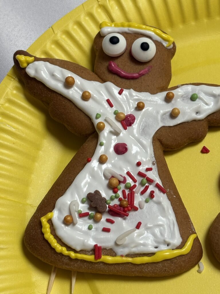 First activity was gingerbread decorating. The children loved it, embracing their creative imaginations, turning biscuits into works of art. Intricate and less intricate. Obvious themes and then… um…. quirky. Some gingerbread even having interesting personalities. Which is saying something for a biscuit!