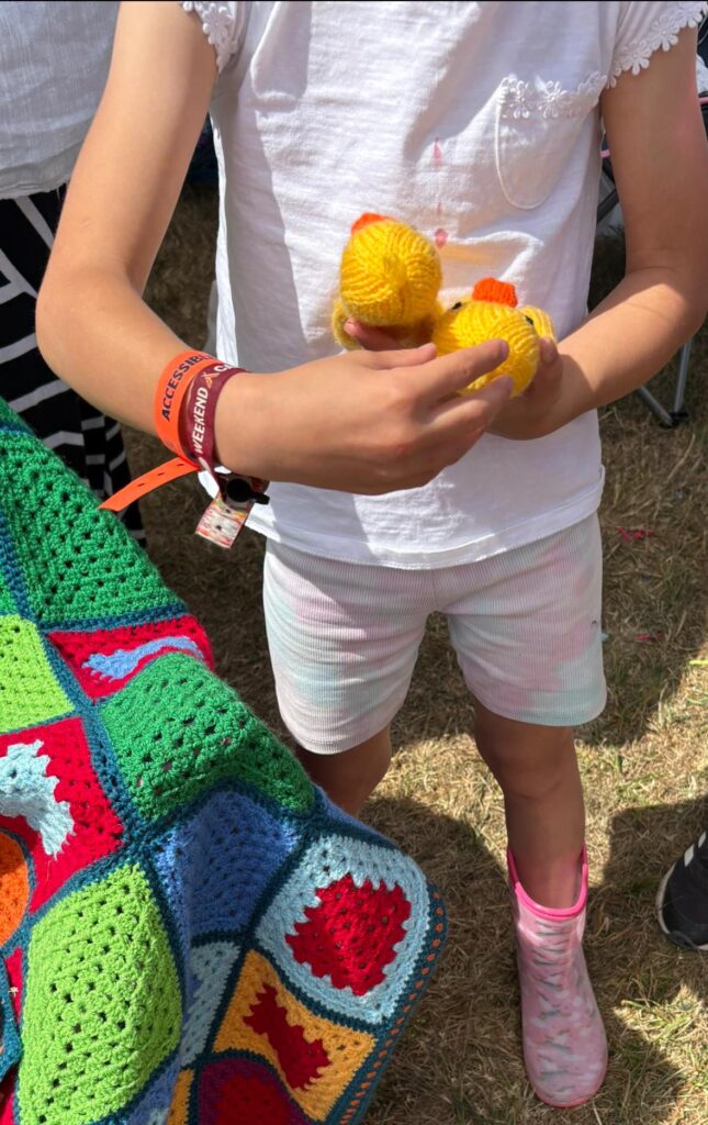 And joyfully back to Camp Bestival last summer. We had really missed it in 2024, because of my family’s Olympic tickets! We had the most wonderful time sharing the woolly love, and making a millionty pompoms! The families loved the crafting, at one point we had over 75 crafting with us, and the little Besties raised nearly a thousand pounds on their own. At both events the raffle for the blanket was so successful, thank you to the crafters. We’ve already been invited back To CB! Watch this space. Thank you so much to lovely Paula P for coming on the Sunday, we really needed you!