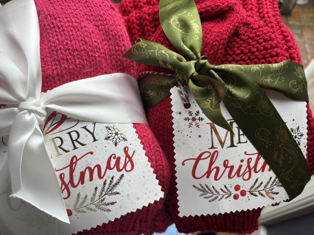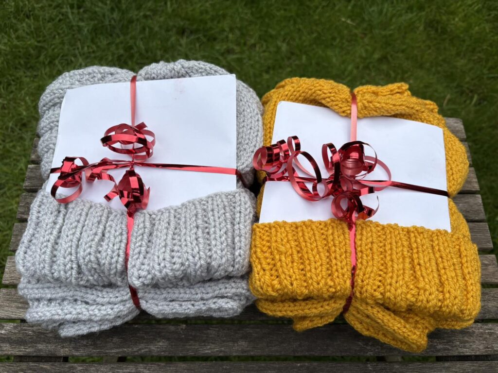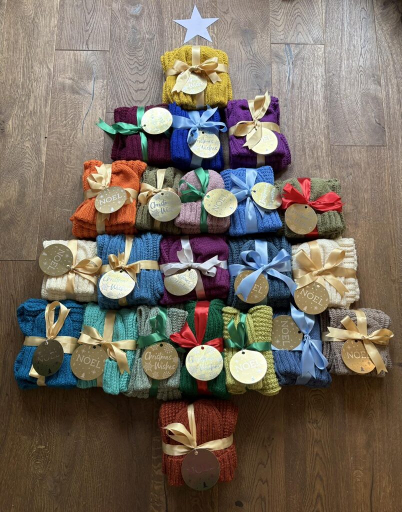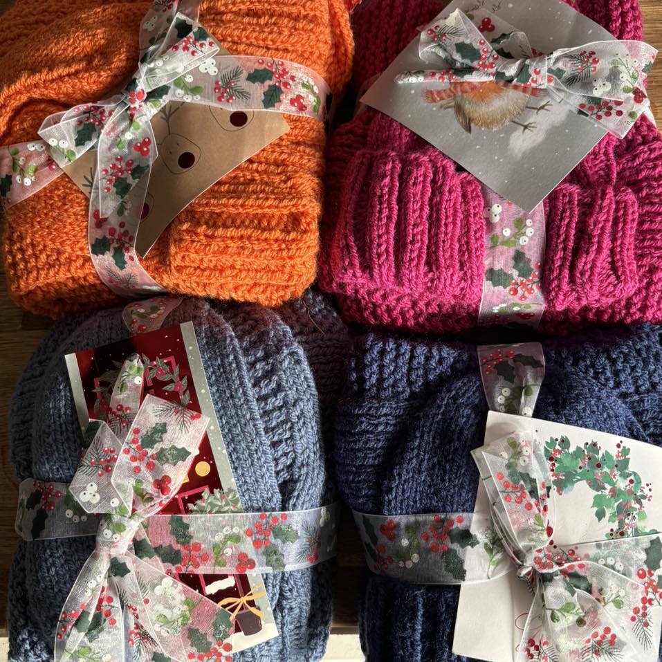 We sent a VAST number of beautifully knitted hat and scarf gift sets for Care Leavers. These are part of the Christmas Dinners’ project started by the inspirational poet Lemn Sissay. The aim is to create a positive memory, and bring happiness and Christmas joy to this group of 18-25 year olds who can be terribly isolated and lonely, especially around Christmas time.