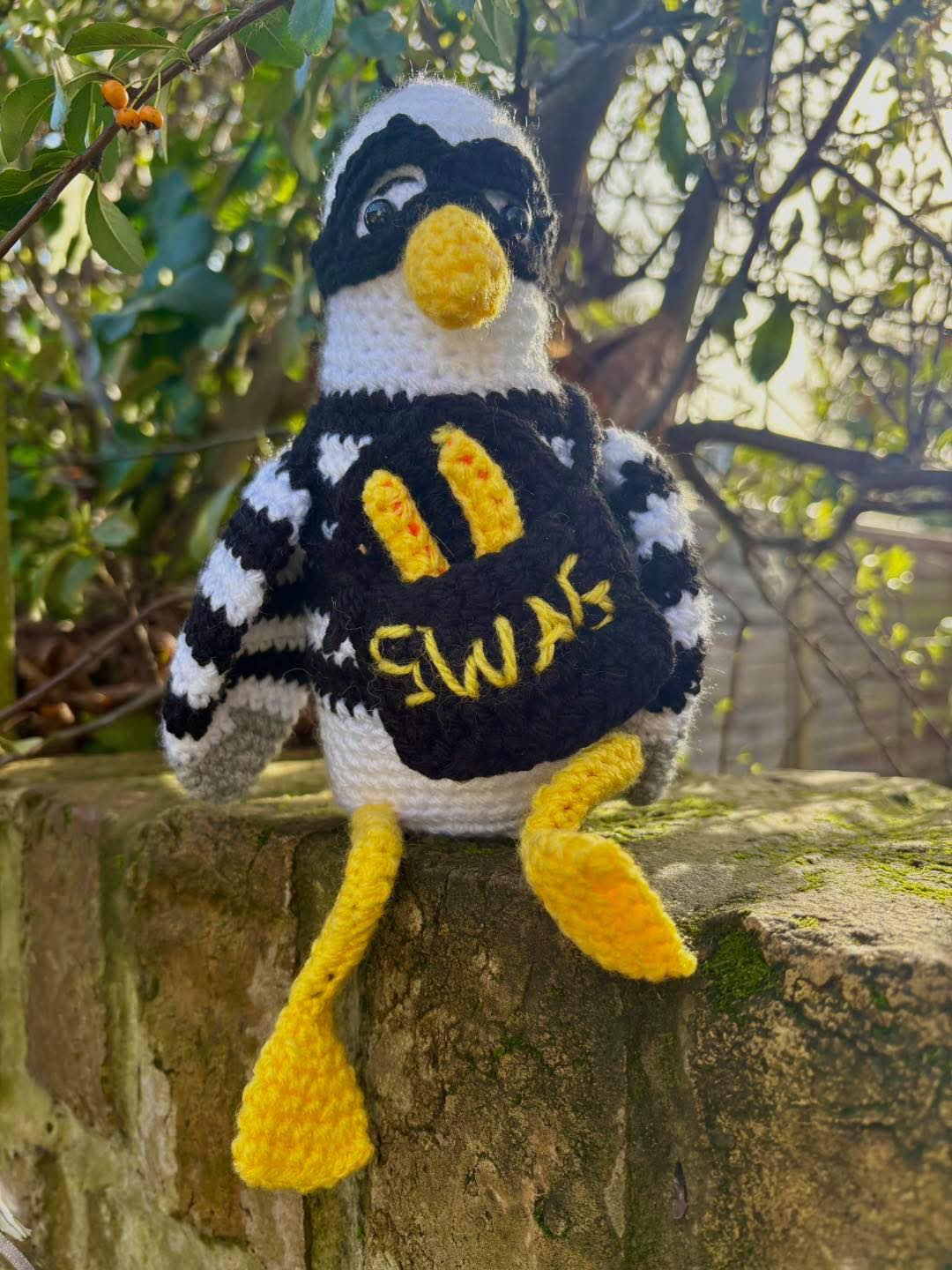 I laughed out loud when I saw this! Chip thieving seagull with two already stashed in his SWAG bag! How cheeky!! Beautifully crocheted, with safety eyes, and sits appropriately 18cm. Love, love, love!