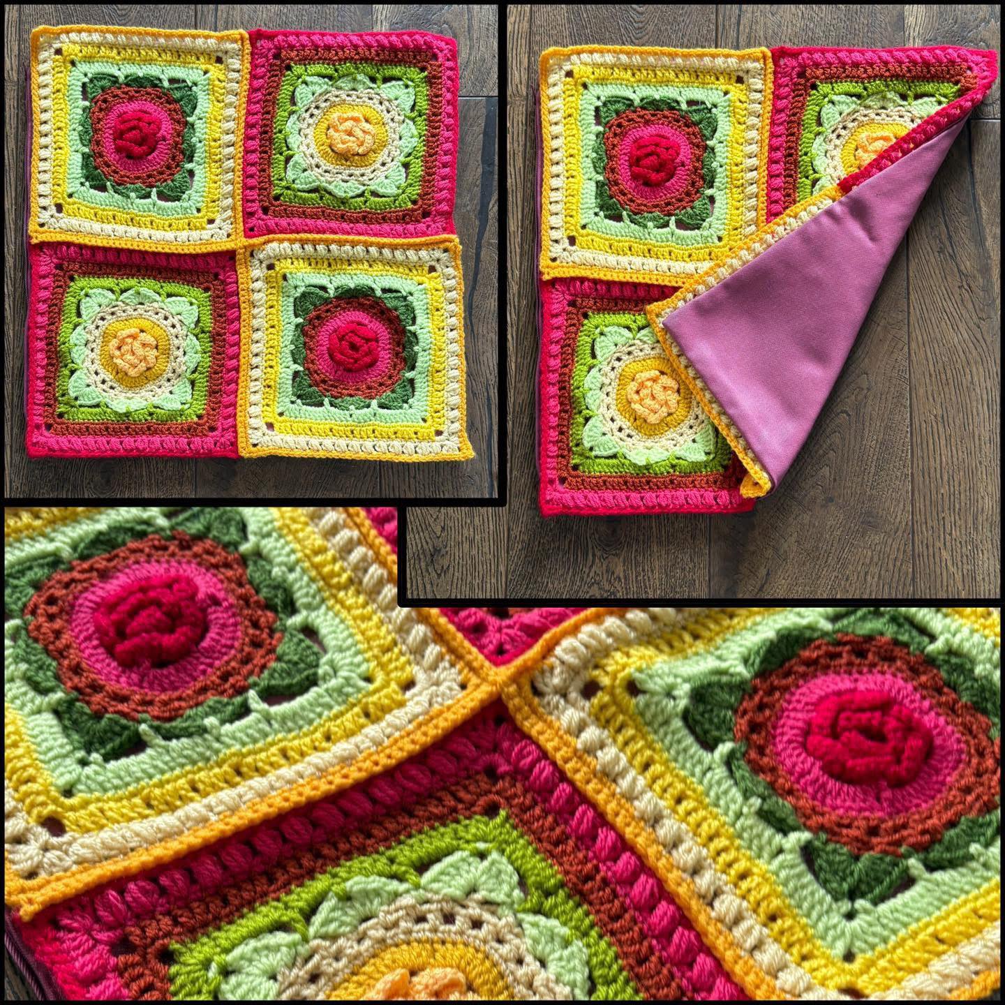 70. Stunning floral cushion cover! Beautifully crocheted in bright Stylecraft Special DK, so super practical and soft. This is absolutely gorgeous. Will need a cushion pad. Cover measures 45cm by 45cm. Zip fastening. The rear is a dusky pink cotton as shown.