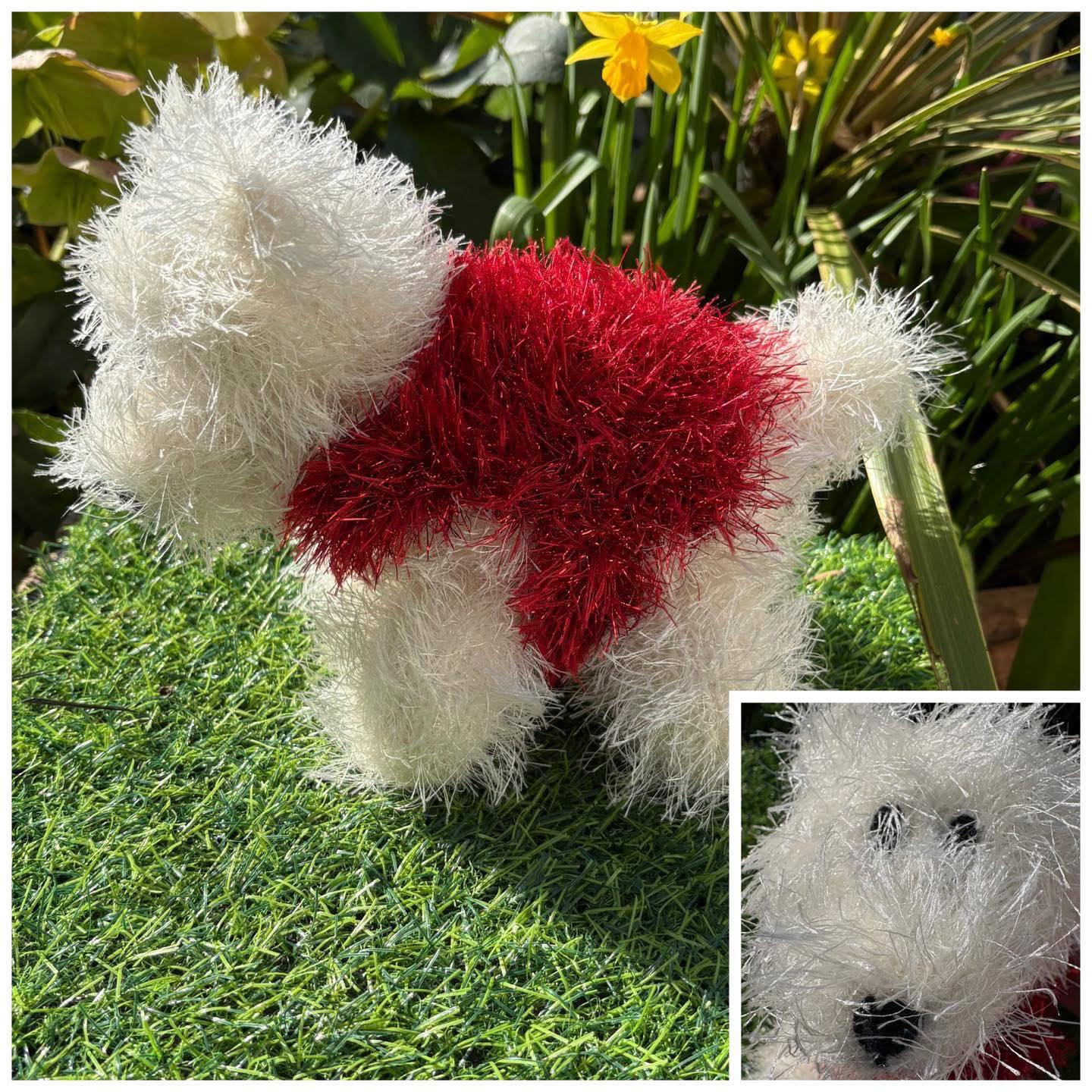 249. Adorable Westie! Reminds me of a lil pup called Gertie! Beautiful in cream and red tinsel yarn with embroidered features. So soft. Just look at its little faaaaaaaaaace! Not suitable for under 3s because of possible yarn shedding. This is too cute! Measures approx 25cm long but was wriggly. So hard to tell.