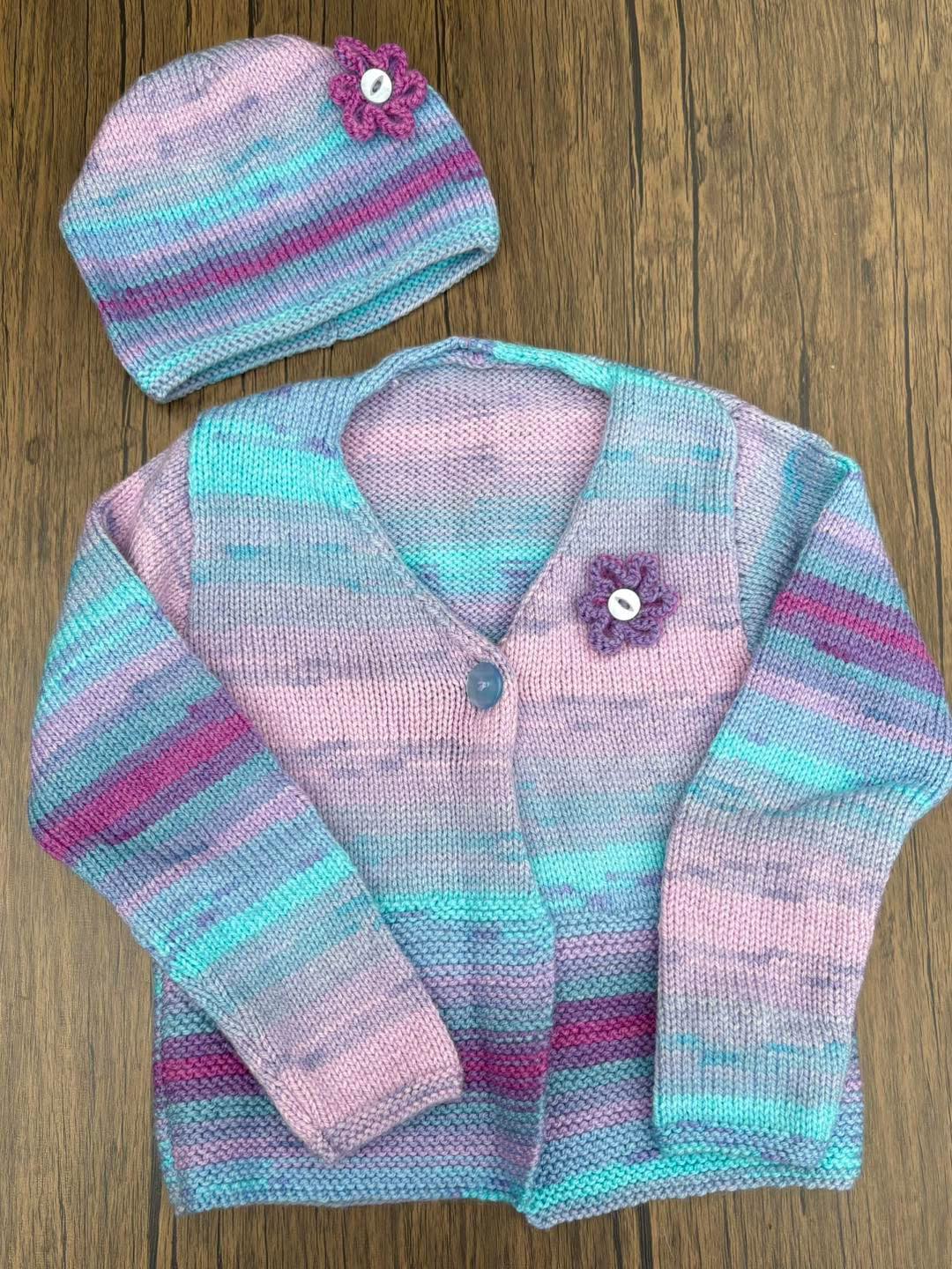 259. .Age 4/5 Just wow. An absolutely gorgeous cardigan and hat set. Just perfect. Beautifully knitted in Robin Paintbox DK. A super soft and practical acrylic. So easy to wash and wear. Glorious.