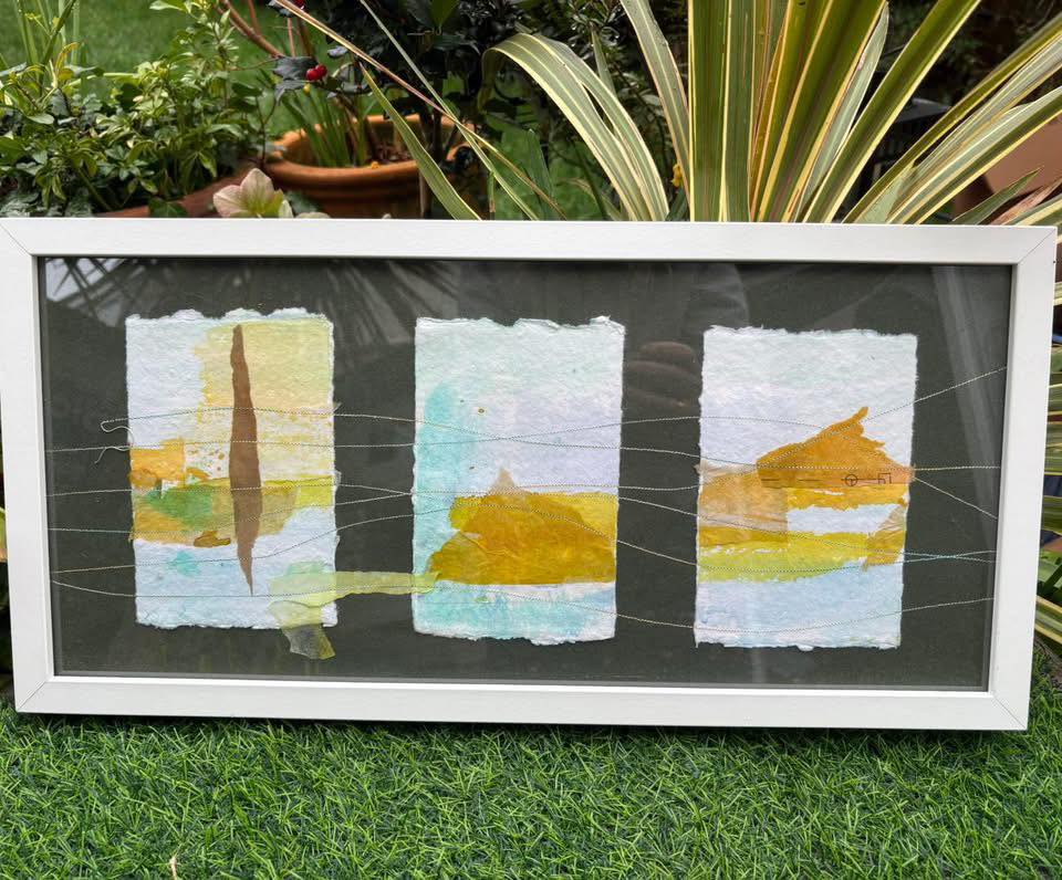 This beautiful original piece, with paint, collage and stitching is divine.It Is glorious. Ready framed. In total this measures 53cm by 26cm. Own a Caroline Ball original!