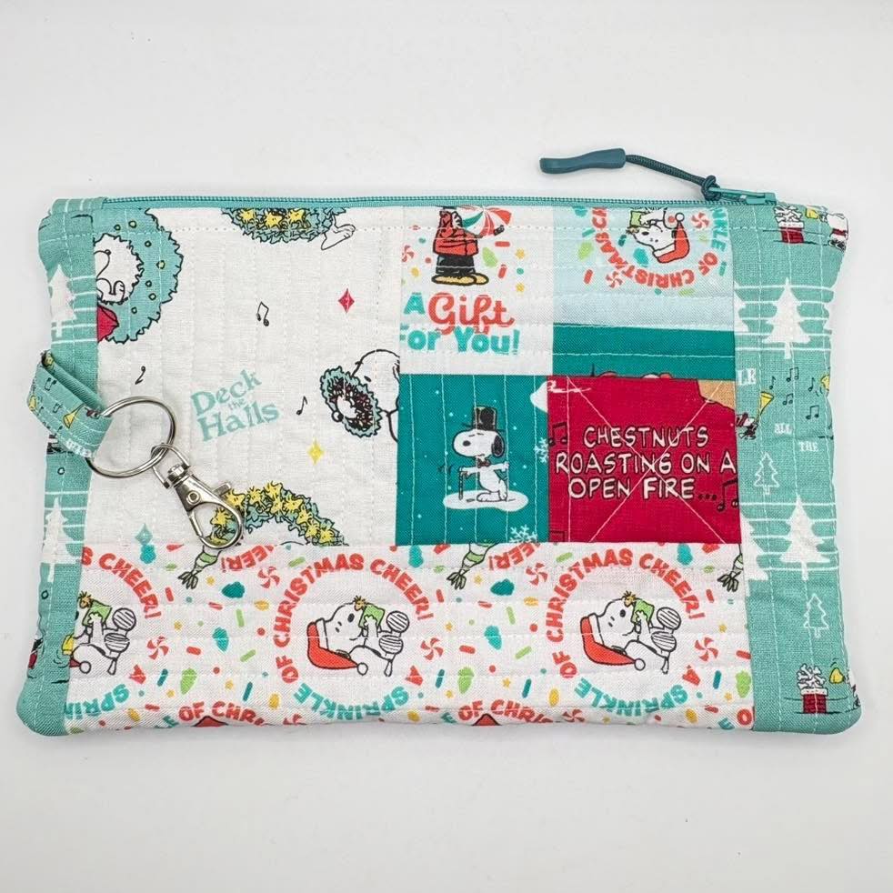 Christmas Craft Sale 2025. Item 104. Festive Snoopy!Gorgeous quilted and lightly padded zipped bag with adorable Snoopy print. Lined in a bright teal bauble print. Perfect for gifts, pencils, hooks, accessories, make up. Comes with a keyring plus lobster clasp. Measures approximately 22cm by 15cm. It’s really lovely!