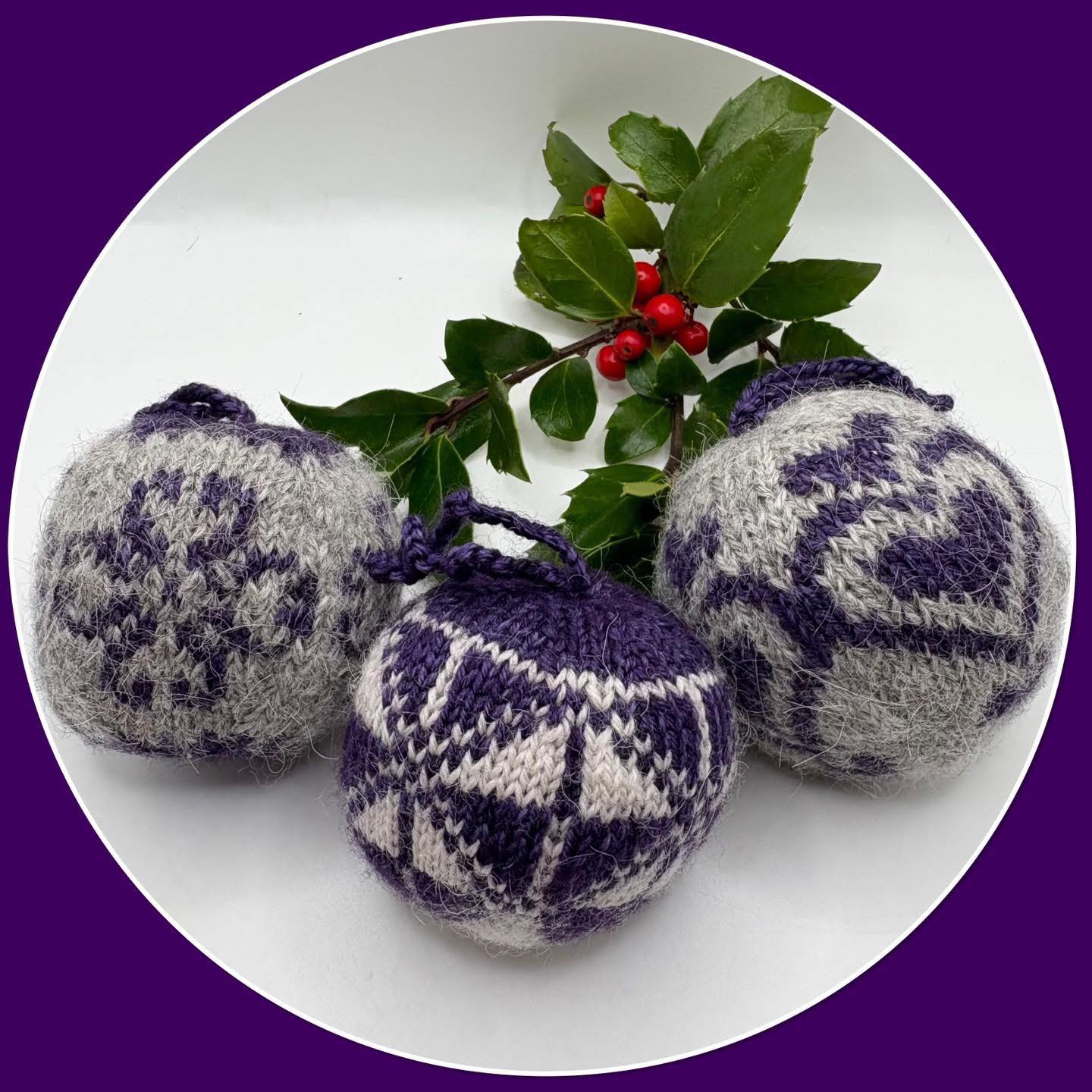 Christmas Craft Sale 2025. Item 108. Three beautifully knitted baubles! The tiniest finest knitting in grape, and silver. These baubles all different and are all astonishing. . Measure approx 8cm tall.