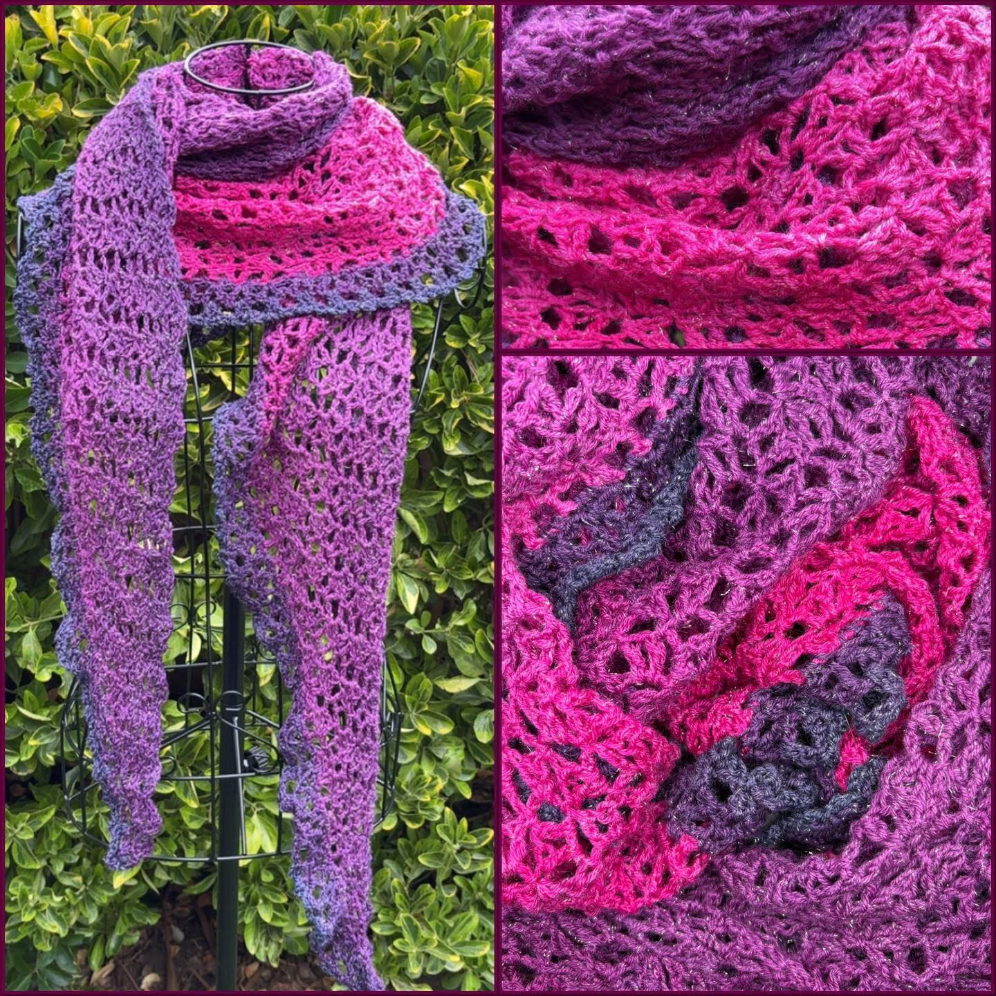 Christmas Craft Sale 2025. Item 102. Stunning Moogly ‘Fortunes Shawlette’This is glorious. From deep purple to vibrant magenta pink and all with a subtle sparkle. A beautiful piece for Christmas! Beautifully crocheted in a 4 ply 70% superwash merino, 20% silk and 10% silver stellina. Measures approx 245cm long and 90cm at its widest point. It’s a stunning wrap/shawl/scarf! Super cosy, soft and lightweight.